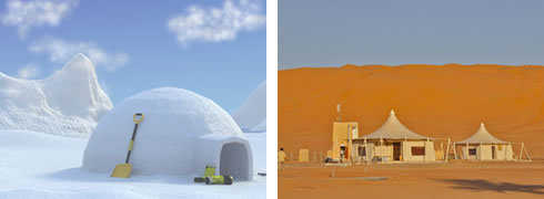 1. A la izquierda vemos un lago en mitad de una montaña. Parece un lugar muy bonito aunque seguramente también muy frío. A la derecha vemos un oasis en mitad del desierto. Se trata de un lugar muy cálido.