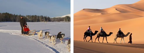 1. La primera imagen muestra un trineo arrastrado por perros. En la segunda imagen vemos varias personas cabalgando camellos.